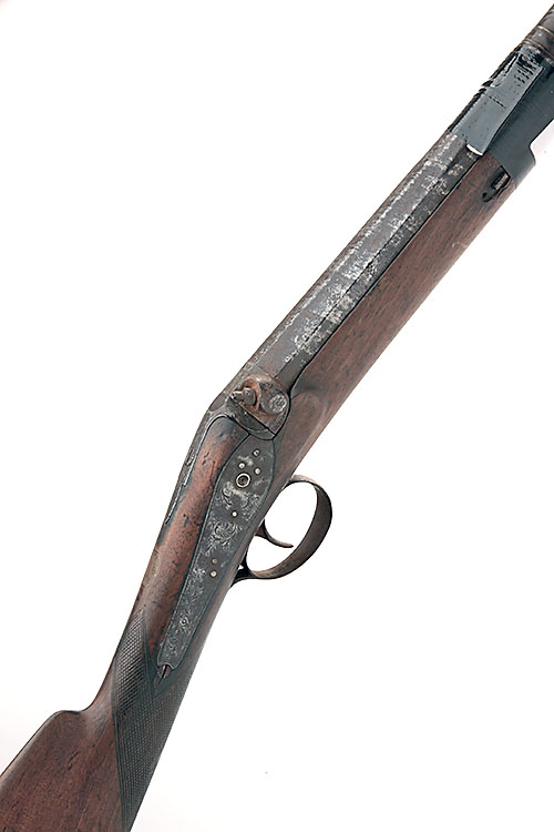 A 16-BORE PERCUSSION SINGLE-BARREL SPORTING GUN FOR RESTORATION SIGNED COCKER, no visible serial number, circa 1850, with shortened 26in. triple staged barre, signed back action lock and walnut half-stock, missing hammer, ramrod and under-rib, possible other losses and faults