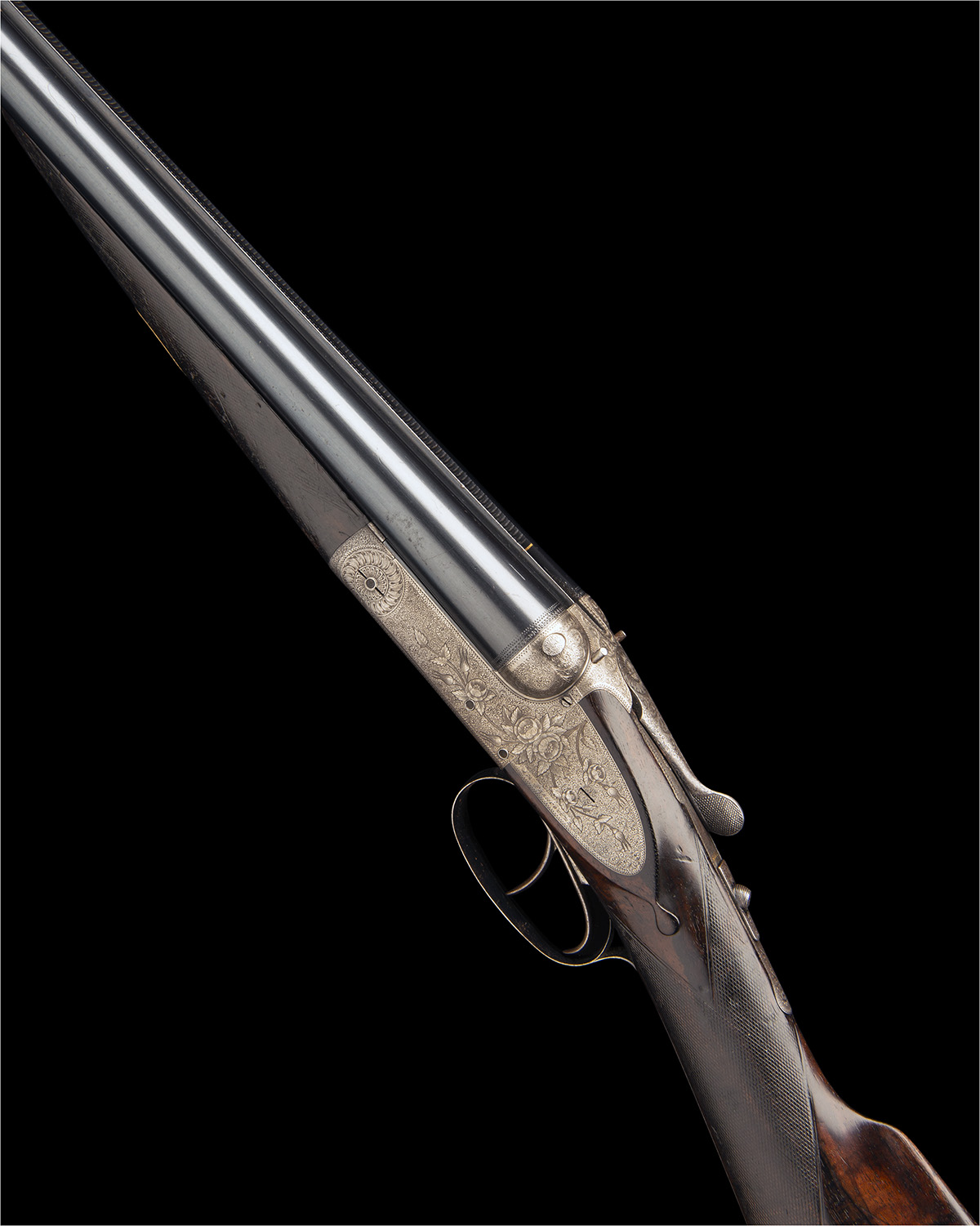 29 1/2in. nitro reproved (in 2018) blacked damascus barrels (struck off at the muzzle ends), ornately file cut rib with a banner engraved in script 'A. FRANCOTTE MAKER & PATENTEE LONDON', 2 1/2in. chambers, bored approx. true cyl. and 1/4 choke, sling swivel partially removed, treble-grip action, the face marked 'ANSON & DEELEY'S PATENT 3273', the standing breech with pin cocking-indicators, automatic safety with gold-inlaid 'SAFE' detail, the action and decorative sideplates very finely engraved with acanthus scrollwork interspersed with floral designs and with beaded bordering, 14 1/8in. well-figured stock, the fore-end inlet with a gold-bordered matted oval escutcheon, weight 6lb. 5oz.