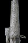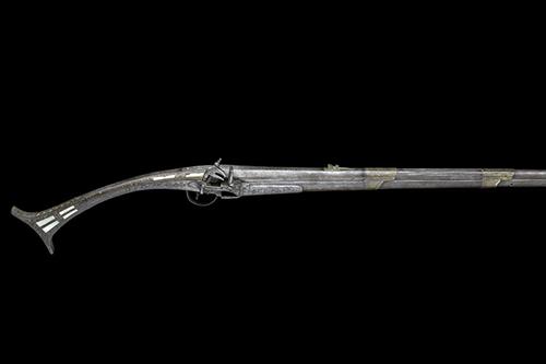 from the Balkan region circa 1820, with octagonal to round 51 1/4in. barrel, the last 6in. of the octagonal section carved with longitudinal flutes, swollen engraved muzzle, false signature at breech and deeply struck oval makers mark, small miquelet lock with carved bridle, the full stock formed from moulded iron plates, engraved and inlaid variously with mother of pearl and brass detail, fish-tailed butt, engraved brass barrel-bands and provision for ramrod (missing)