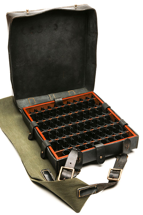 of recent construction, with provision for 100 cartridges (one clip damaged, one missing), leather outer