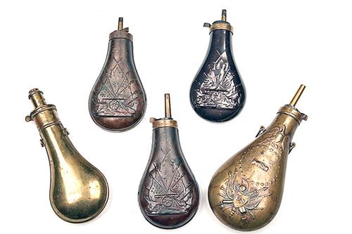 A COLLECTION OF FIVE REPRODUCTION POWDER-FLASKS, (5)