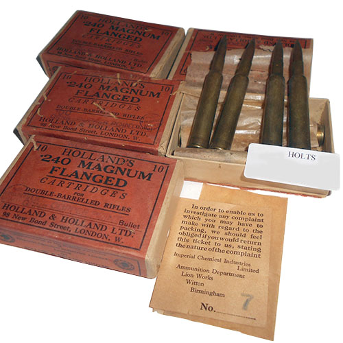 FORTY .240 MAGNUM FLANGED NITRO EXPRESS CARTRIDGES comprising of four holland & holland cartons of ten 100 grn copper point , all in original retail cartons, highly collectable