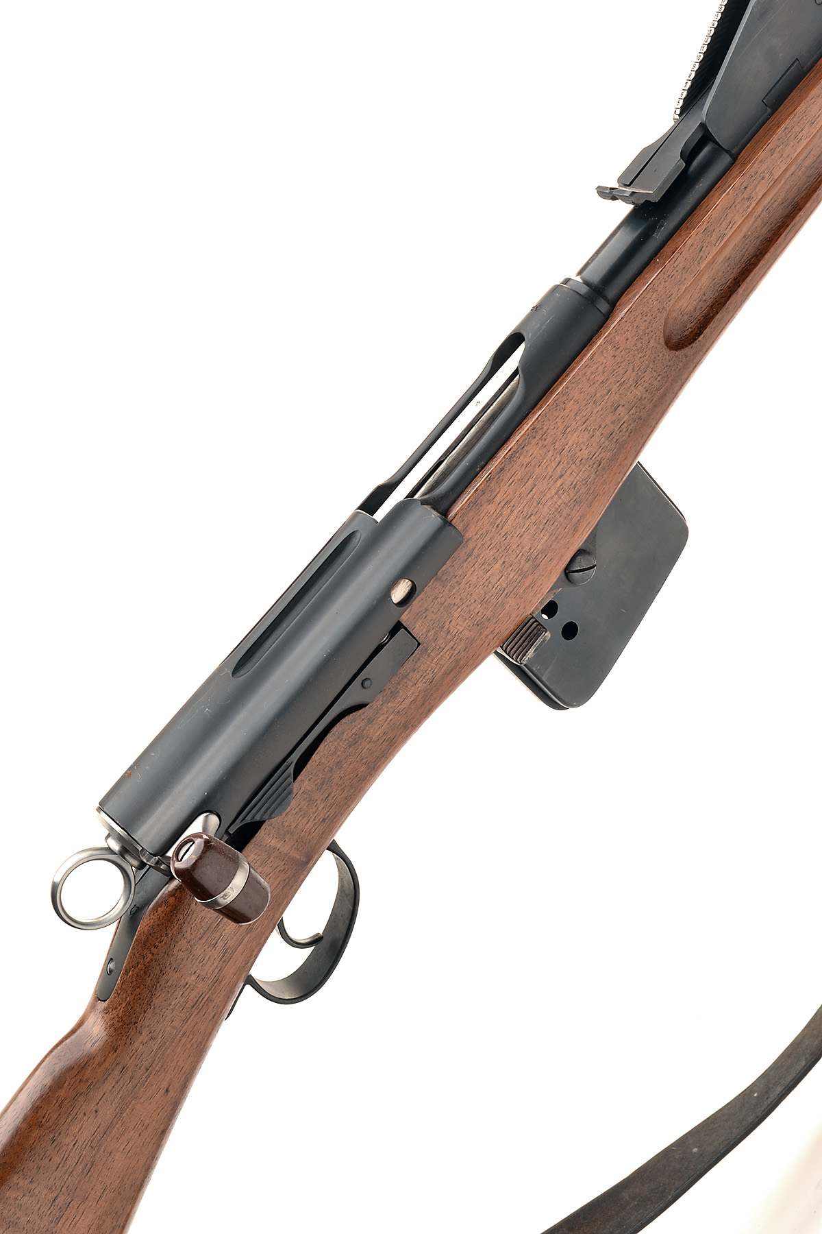 with 30 7/8in. blued sighted barrel (finish excellent), blued receiver, 12in. regulation straight-hand stock, blued exposed magazine with cut-off, leather sling and brass muzzle cover, little used condition
