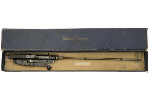circa 1950, with 14 1/2in. brass barrel, blued air-chamber with integral six-shot magazine with rotating cover, the body of the device marked 'HAMMERLI TRAINER MOD K31', 'PATENT' ('Hammerli Trainer' with gilt infill) and the serial number, side-lever cocking with bakelite toggle in imitation of the rifle, much original finish, together with its blued top-clamp and complete in its maker's blue card carton with paste-board insert