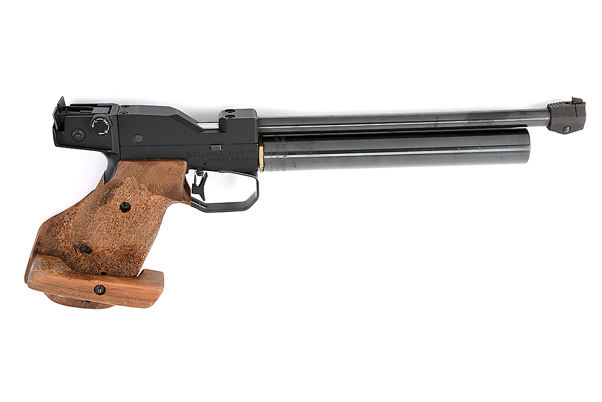 A CASED .177 CO2 POWERED SINGLE SHOT TARGET AIR PISTOL SIGNED FEINWERKBAU MODEL 2 serial no. 16712