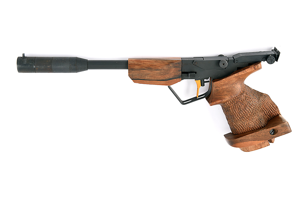 with a 10in. barrel open sights adjustable rear sight top loading breech port match adjustable trigger with ergonomic left hand pistol grip with accessories. Not tested