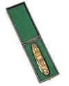 circa 1890, 3 1/2in. overall closed, the bronze scales on one side with embossed depictions of Kruger and De Wet, the reverse with the coat of arms of the Transvaal and Orange Free-State and inscribed 'TRANSVAAL, LENDRACHT MAAKT MACHT. ORANGE-FREIST', with large and small folding blades marked 'MADE IN GERMANY G. FELIX, SOLINGEN (remainder obscured), folding corkscrew to reverse, complete with its jade green velvet lined blue leatherette box (clasp incomplete)