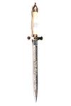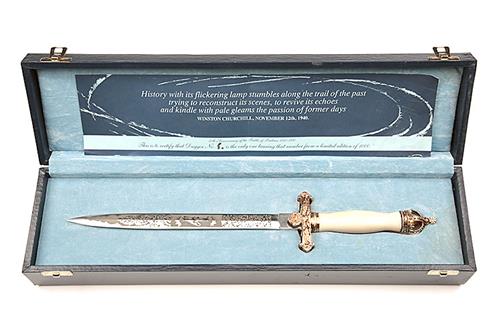 A CASED LIMITED EDITION 'BATTLE OF BRITAIN 50TH ANNIVERSARY' DAGGER, number '5' of 1000 produced, with double edged 9 1/2in. blade etched with scroll-work around a central panel depicting a Spitfire aircraft, the reverse similar but with R.A.F. eagle-wings, moulded and gilded cross-guard, smooth ivorine grip surmounted with a pierced Kings Crown pommel, not supplied with a scabbard, in its makers blue leatherette case with pale blue flock lining, the lid with gold-blocked lettering 'TO COMMEMORATE THE 50TH ANNIVERSARY OF THE BATTLE OF BRITAIN' and '1940-1990' all below an R.A.F. device and complete with its certificate
