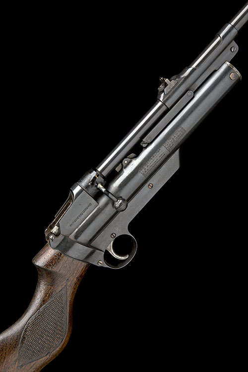 for 1939, with 25 1/2in. detachable barrel, dove-tailed fore-sight, elevating notch rear-sight, rotating bolt locking, peep-sight fitted to rear of receiver (eye-piece missing), plain air-chamber with model details and five countries patent numbers, trigger unit with manufacturer's details, semi saw-handled walnut butt-stock (crack at head), horn heel-plate and old re-finish throughout