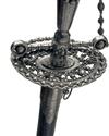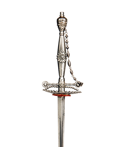 first quarter of the 19th century, with concave triangular cross-section 32in. blade retaining some original polish, polished pierced steel oval guard with applied cut-steel decoration (cracked across in antiquity) and red velvet scabbard buffer, straight cross-guard with small circular quillions with loose faceted cut steel balls within, cut steel pas-de-ane, fully faceted cut-steel grip-piece with applied decoration, en-suite urn pommel and cut-steel chain knuckle-bow, complete with its black leather scabbard with iron mounts