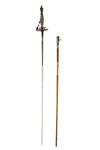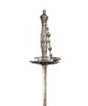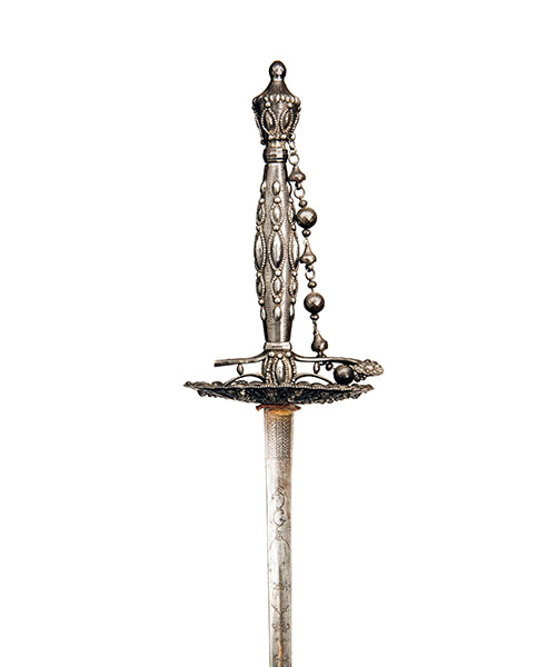 Georgian, circa 1800, with concave triangular cross-section 33in. engraved blade retaining strong traces of its original blue and gilt finish for the first third, the remainder lightly stained, pierced steel oval guard with applied free-moving cut-steel decoration, narrow cross-guard with small pas-de-ane (one quillion missing), fully decorated cut-steel grip-piece with en-suite urn pommel and cut-steel chain knuckle-bow, complete with its velum scabbard with iron throat mount marked 'R. JOHNSTON LATE BLAND & FOSTER, SWORD CUTLER AND BELT MAKER TO HIS MAJESTY, ST JAMES ST. LONDON', (tip mount absent)