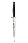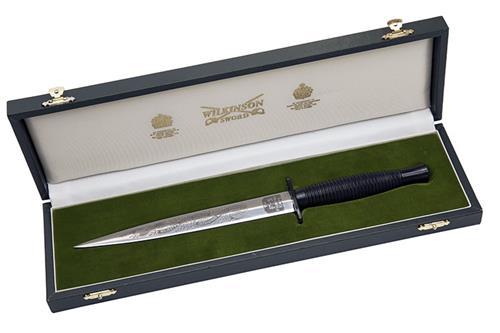 manufactured in 1991, with 7in. polished stiletto blade etched with foliage and a flowing banner with 'OPERATION DESERT STORM 17TH JANUARY 1991', and the maker's trademark at the forte, the reverse with a similar banner etched 'HER MAJESTY'S ARMED FORCES DEFENDING WORLD FREEDOM' the forte etched with the the knife model, polished blacked boat-shaped cross-guard and ribbed metal hilt, not supplied with a scabbard, together with its green leatherette presentation box with Wilkinson's trademark to the satin of the lid lining and the tray lined in olive green velvet, as new