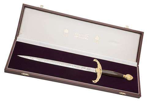 WILKINSON SWORD LTD., LONDON BOXED COMMEMORATIVE PONIARD, MODEL 'WORLD WAR II FIFTY YEAR ANNIVERSARY', manufactured in 1995, with polished narrow 10 3/4in. blade etched with the inscription 'PEACE COMMANDS A HIGH PRICE - FREEDOM HAS NEVER BEEN FREE. TO ALL THOSE WHO FOUGHT, WORKED AND SUFFERED; AND PAID WITH THEIR LIVES TO BRING PEACE TO THE WORLD 50 YEARS AGO, AND TO ALL THOSE WHO DEFEND OUR PEACE TODAY, THIS BLADE IS GRATEFULLY DEDICATED' together with '1945-1995', the reverse with 'TO CELEBRATE FIFTY YEARS OF PEACE AND RECONCILIATION SINCE THE YEAR 1945 WHEN HOSTILITIES BETWEEN NATIONS FINALLY HALTED WITH THE ENDING OF WORLD WAR II' along with 'PEACE AND VIGILANCE' with a depiction of a shepherd with his dog and the manufacturer's trademark at the forte, carved and moulded gilt cross-guard in the form of an eagle with spread drooping wings, the wing-tips terminating in foliage and berries, smooth walnut grip swelling just below the centre, the end-piece with a shaped pommel carved with a world map, not supplied with a scabbard, complete with its red leatherette box with satin lined lid bearing the Wilkinson trademark, the tray lined in burgundy velvet, appearing unused