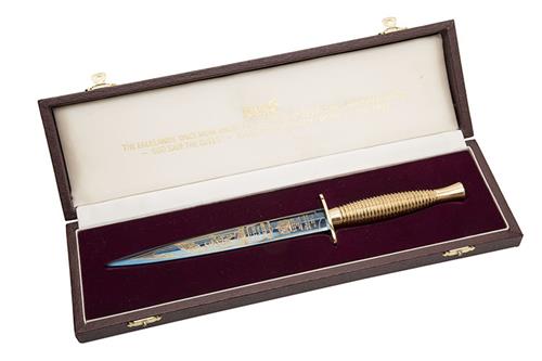 manufactured in 1982-83, with 7in. polished blued stiletto blade etched with a gilded image of British paratroopers within a gilt border, the reverse with standing paratrooper raising a Union Jack above a newspaper and scroll declaring 'VICTORY IN THE FALKLANDS' and the maker's trademark at the forte, gilded boat-shaped cross-guard, gilded ribbed metal hilt, not supplied with a scabbard, together with its red leatherette presentation box with Wilkinson's trademark to the satin of the lid lining along with the gilt wording 'THE FALKLANDS ONCE MORE UNDER THE GOVERNMENT DESIRED BY THEIR INHABITANTS - GOD SAVE THE QUEEN - MAJOR GENERAL JEREMY MOORE - JUNE 1982' the tray lined in burgundy velvet, as new