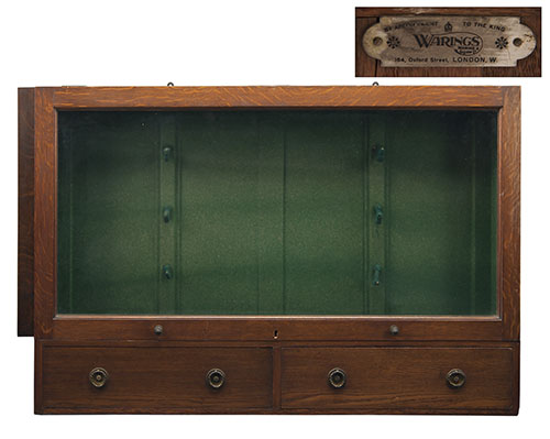 externally measuring approx. 49 3/4in. length, 31in. height and 6in. depth, oak with hinged glazed front and two bottom drawers, green baize lining, with key, the rear with makers plaque inscribed 'WARINGS. WARINGS & GILLOW LD. BY APPOINTMENT TO THE KING. 164, OXFORD STREET. LONDON. W.'