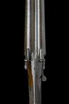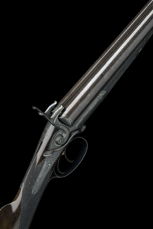 29 3/4in. bold damascus barrels, the rib engraved 'W. HORTON. MAKER. NO.5 WEAMAN STREET. BIRMINGHAM', the breech end with acanthus scroll detailing, the pinfire apertures with starburst designs, carved serpentine fences, unsigned back-action locks with finely carved hammers, bold border and acanthus scroll engraving, the action bar with crosshatch bordering, the top tang with feathered designs, retaining traces of original colour-hardening, 14 1/2in. figured stock with engraved steel buttplate, fore-end with crosspin release catch and horn finial, weight 7lb. 4oz.