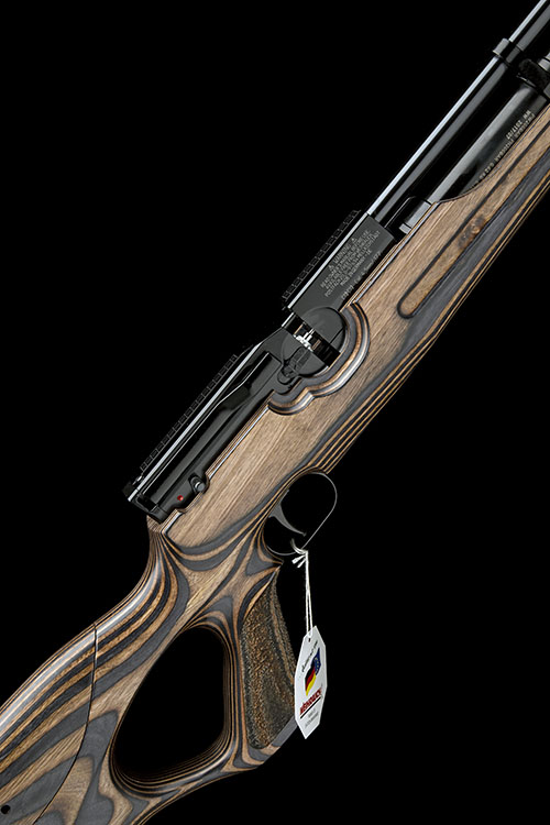 with blued 19 1/4in. barrel including detachable 'WEIHRAUCH' sound moderator, machined bolt-action receiver with detachable magazine and integral dove-tail for telescopic sight, rear-mounted safe, laminated wood ergonomic thumbhole half-stock with laser-cut stippled panels and adjustable comb, quick-fill adaptor and pressure-gauge to the front of air-chamber, complete with its maker's card carton and instructions