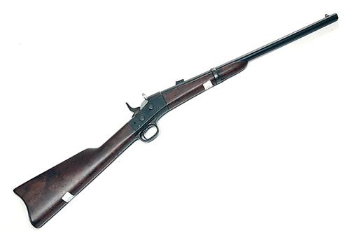 AN 11x57mm (SPANISH) SINGLE-SHOT CARBINE SIGNED REMINGTON, MODEL 'ROLLING-BLOCK', no visible serial number, with 20 1/2in. sighted barrel, typical receiver with central hammer and rolling breech (chamber blown internally), walnut straight hand butt-stock and splinter fore-end, iron furniture