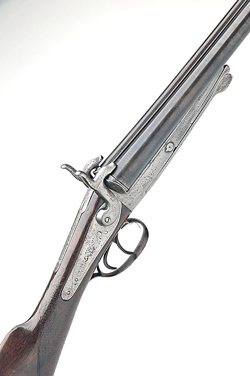 A 16-BORE PINFIRE DOUBLE-BARRELLED HAMMERGUN, MODEL 'LEFAUCHEUX'S PATENT', no visible serial number circa 1865, with 29 1/4in. barrels, engraved top-tang, shallow carved fences, borderline and scroll engraved back-action locks, plain hammers, walnut butt-stock, iron heel-plate, the action with forward facing under-lever and iron splinter fore-end held with a second lever