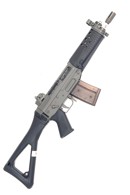 A .223 SEMI-AUTOMATIC ASSAULT-RIFLE SIGNED SIG, MODEL '552-2', serial no. 20571, with grey phosphated 10in. barrel including three-prong flash-hider, grey receiver, folding abs black plastic butt, pistol-grip and fore-end, transparent plastic magazine, appearing little used (missing cocking handle)
