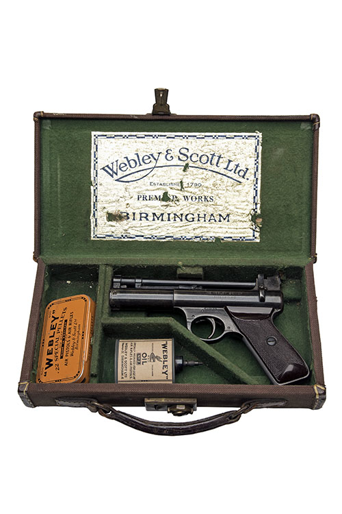 circa 1937, with 6 5/8in. barrel, blade fore-sight, adjustable notch rear-sight, stepped air-chamber with three lines of patents on the right side of nose, three pin trigger-unit and brown bakelite chequered grips (finish dulled), in its period Webley & Scott' canvas case, compartmented and lined in green felt and containing a period rectangular orange tin of .22 Special pellets and a reproduction 'valvespout' oil can (small losses to the inner lid trade label, exterior faded with some staining