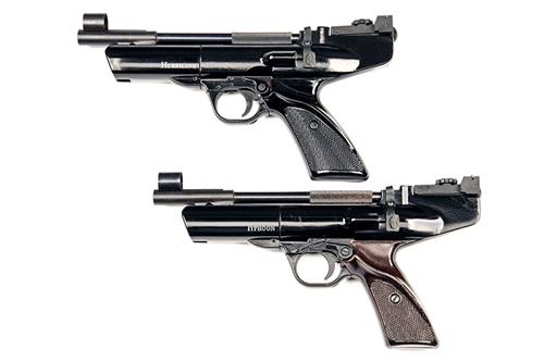 the Typhoon model in .177 and fitted with brown undersize chequered plastic grips, the Hurricane model in .22 and with black plastic chequered grips, both in their maker's black card cartons with red flocked lining trays, instructions and telescopic sight mounts and appearing little used (some storage scuffs and light damage to boxes)