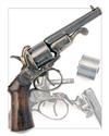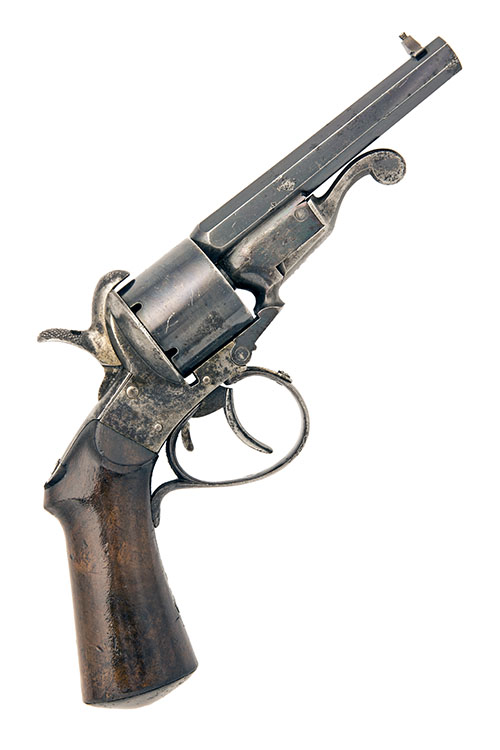 circa 1865, with blued octagonal 4in. barrel, dove-tailed bead fore-sight, sighting notch to hammer nose, swing under-lever break open design featuring a split cylinder arbor clamp, the underside of hinged signed 'JAVELLE M. ST. ETIENNE' in a crescent over 'BTE S.G.D.G.', plain blued cylinder locking on the hand, oversize pin shield, exposed hammer, guarded trigger (some pitting to guard) and smooth semi saw-back walnut grip with domed iron butt-cap, strong amount of finish remaining to barrel, remainder discoloured
