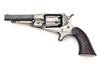 third model circa 1871, with octagonal 3 1/2in. barrel, the top-flat signed 'PATENTED SEPT 141858, MARCH 17 1863' over 'E. REMINGTON & SONS, ILION NEWYORK U.S.A.' over 'NEW MODEL', solid iron frame with sighting groove to top-strap, iron trigger unit with spur trigger, exposed hammer, iron grip-straps with smooth walnut grips and hinged under-barrel rammer, stripped of finish except barrel