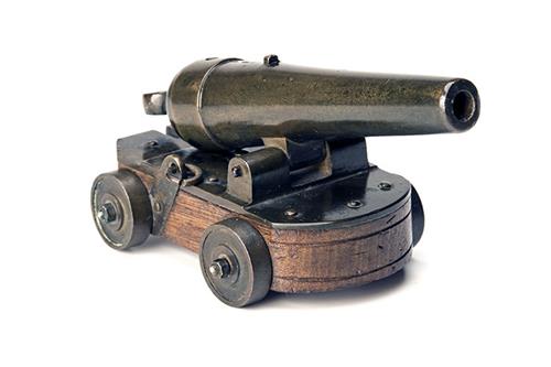 circa 1885, with tapering plain round 4 1/2in. barrel including ring cascabel, reinforced at breech, period London proofs, notch rear-sight, fitted to a flat oak trolley via bronze mounts and equipped with four bronze turned wheels