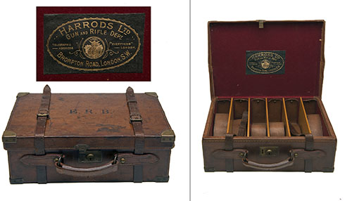 for approx. 450 cartridges, the lid interior lined with maroon baize, a leather gold-tooled Harrods Ltd. trade label, six leather lifters, five oak removable dividers, brass lock (key missing), the lid exterior with the initials 'E.R.B.'