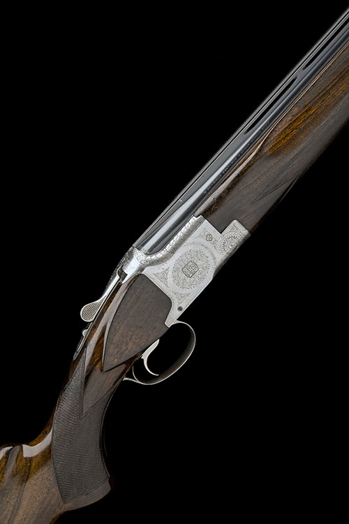 30in. nitro barrels with 16mm ventilated matt top-rib, 2 3/4in. chambers, bored approx. 3/4 and full choke, hold-open toplever, manual safety with integral barrel selector switch, border and partial bouquet and scroll engraving, 13 3/4in. pistolgrip stock including 1in. ventilated rubber recoil pad, fore-end wood with split, weight 8lb.