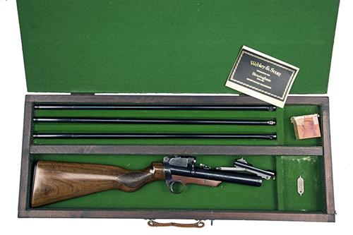 third series circa 1936-39, with blued 25 1/2in. sighted interchangeable barrels, push-button barrel release, bolt handle locking catch, blued air-chamber with the make and model details to the left hand side and five lines of patents to the right, trigger-unit with no safety catch, walnut chequered saw-handled butt-stock, adjustable peep-sight, replacement plastic heel-plate, the whole re-finished and complete with unnumbered .177, .22 and a late reproduction .25 barrel for the same model, all also re-finished and a later amateur produced take-down wood storage case fitted internally for the rifle with the three barrels detached