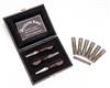 circa 1935, seven in total, in their aluminium tubes (one without tube), Parker Hale labels reading 'Parker Hale Barrel Gauge Calibre.... For detecting the presence of Metallic Fouling in Rifle Barrels. Hard all through, True to 1/10.000th', the calibres marked by hand respectively '302 & 3, 3025, 303, 307, 308, 309'; together with a Pendleton Royal (Manufacturers & Suppliers of Rifle, Gun & Pistol Implements) cased set of three brass and walnut handles small turnscrews
