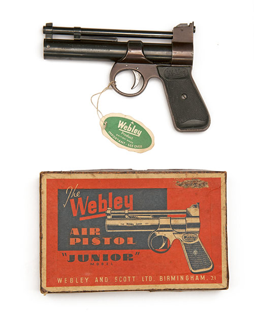 circa 1958, with blued 6 1/2in. barrel, adjustable rear-sight, pull-back barrel latch, blued air-chamber, two pin trigger group, replacement reproduction chequered hard rubber grips, the whole retaining virtually all its original factory finish (faded to purple on frame) and complete with its maker's card carton with some minor spare parts including the original grips (chipped), swing-ticket, paperwork and a period box of Milbro, tin of Webley and sample Webley pellets packet