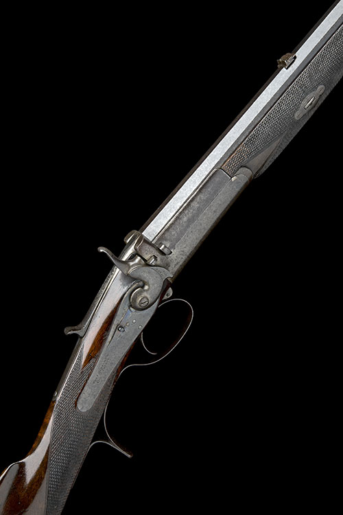 26 1/2in. black powder only octagonal barrel, matted sight flat, replacement blade fore-sight, standing notch rear sight with two folding leaf sights marked for 80 and 120 yds, and with white metal inlaid sight lines, the top flat engraved 'THOMAS HORSELY MAKER. YORK. PATENT. 2410 & 1138.', T. Horsley patent action incorporating Horsely patent pull back toplever, patent no. 2410 of 1st October 1863, and Horsley patent retracting striker, patent no. 1138 of 17th April 1867, non rebounding bolted back-action lock with cammed hammer, the obverse shaped to imitate a lockplate, retaining slight traces of original colour-hardening and finish, 14 1/18in. stock, steel buttplate, semi-beavertail fore-end with fluted finial, weight 6lb. 4oz., in its makers case with some accessories
