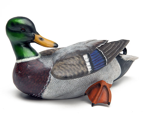 A FINE HAND CARVED AND PAINTED MALE MALLARD DUCK,
