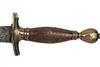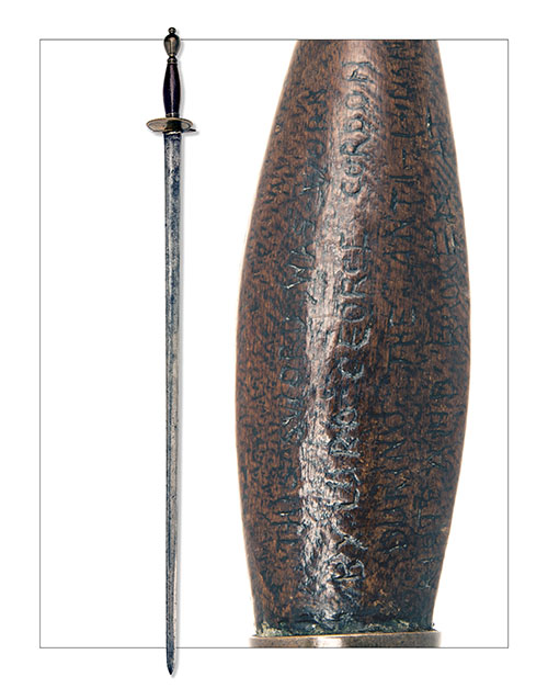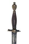 with single edged broad fullered 33in. spear-point blade, kidney shaped brass guard, originally double-sided, one side now cut flat for wall-mounting, the knuckle-guard and quillion broken off and absent, faceted urn pommel and wood grip missing binding, the grip inscribed 'THIS SWORD WAS WORN BY LORD GEORGE GORDON DURING THE ANTI-PAPIST RIOTS AND BROKEN AT THE BURNING OF NEWGATE, 1780'