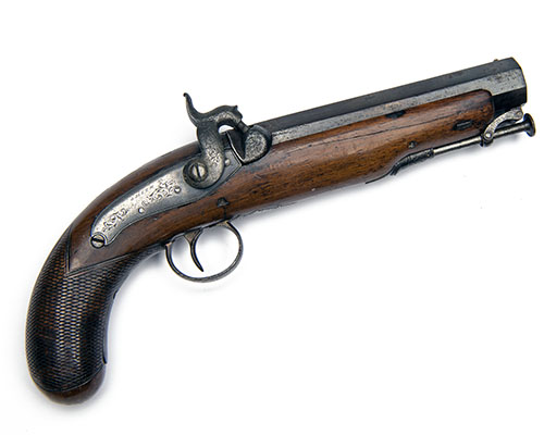 A 16-BORE PERCUSSION SINGLE-SHOT 'MANSTOPPER' TRAVELLING-PISTOL, no visible serial number,
