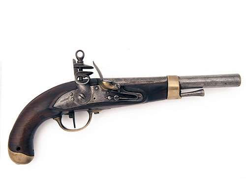 possibly Belgian or Russian circa 1830, with iron 9in. octagonal to round barrel, solid top-tang, military style lock signed 'A. BARREN' at the tail and with cyrillic markings below the pan, ringed top-jaw screw, brass pan, walnut half-stock, iron full-length back-strap, brass rounded spurless pommel, iron trigger-plate with brass bow, brass nose-cap joined to the side-bar plate and iron ramrod, the butt drilled through for a lanyard