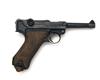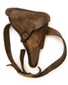 dated for 1917, with blued 4in. barrel, maker's mark to toggle, blued receiver and frame, slight traces of straw finish to ancillaries, provision for stock-board to heel, all matching numbers except sideplate (un-numbered, re-finished) and magazine, chequered walnut grips and a fair amount of original finish throughout except where noted, complete with a period leather service holster for same and a matching leather waist-belt with brass and nickel Imperial German buckle
