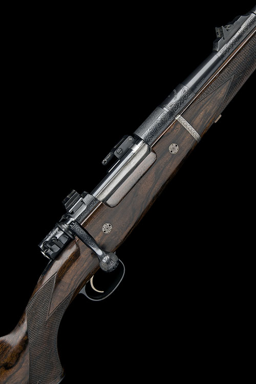 standard Mauser action with thumb cutout and partially visible Mauser Oberndorf A/N details, telescopic sight side-mounts with telescopic sight rings engraved with the calibres and serial numbers, the receiver ring with celtic knotwork and mythical beasts, the bolt engraved en suite, florally engraved recoil blocks, hinged floorplate with military style release, and engraved with further celtic designs and beasts, the triggerguard engraved 'JE SUIS PRES', blued finish overall, highly-figured pistolgrip stock with cheekpiece, engraved steel pistolgrip-cap, sling swivels, 14 1/4in. pull including 1in. leather covered recoil pad, weight 9lb. 3oz., in its fitted brass-cornered oak and leather take down case with provision for both sets of barrels and also for two telescopic sights, the lid with a brass plaque inscribed 'B. Laubscher Rifle commissioned by Andrew M. Meyers 1st January 2006