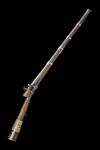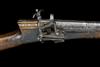 circa 1800, with fine damascus octagonal 25in. swamped barrel, bead fore-sight, standing aperture rear-sight, arabesques engraved to top of breech, small miquelet lock with traces of gilt decoration and gullwing hammer-jaw screw, walnut saw-handled straight hand full-stock with ivory and metal pin decoration to top of wrist, broad band of ivory and metal pin decoration around butt, deep horn butt-end with contrasting plate, stud trigger, the underside inlaid with three carved ivory fish, four remaining white metal engraved and shaped barrel-bands (one absent) and iron under-barrel ramrod