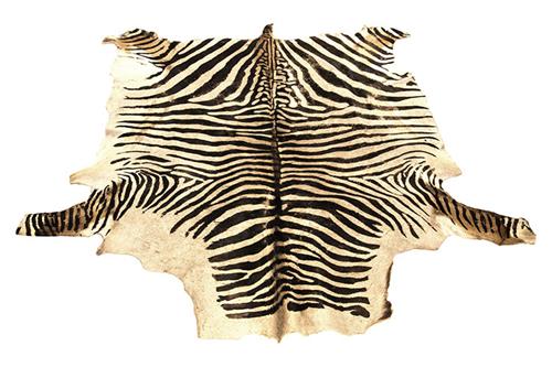 A VINTAGE COW SKIN IN THE FORM OF A ZEBRA un-lined, measuring 80in. x 72in., without head and tail, painted cow skin