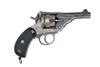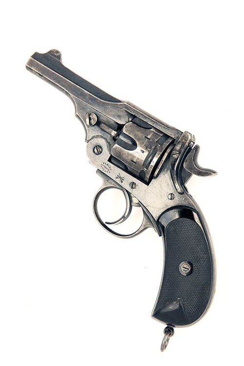 circa 1895, with 4in. barrel, blade fore-sight, notch for sighting to stirrup-latch, coin slot cylinder release, holster guides, fluted automatic ejecting cylinder with narrow locking notches, break-open frame, broad hammer spur, hard rubber chequered birdshead grips with lanyard ring at heel, the front-strap marked with a 'C.G' broad arrow stamp, sold out of service stamps and much original faded finish