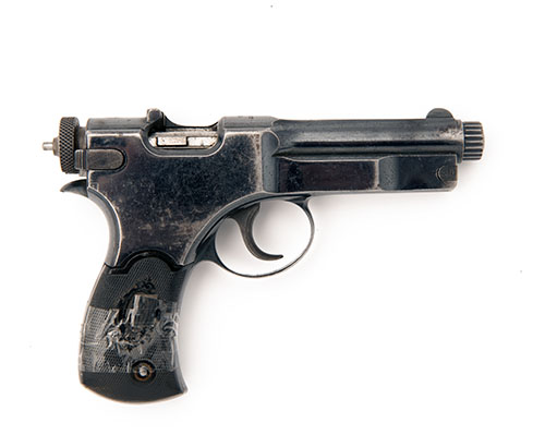 circa 1906, with unique 'long-recoil' 4in. sliding barrel and bolt, blued barrel shroud and receiver, the top-flat signed 'J.P. SAUER & SOHN, SUHL, the receiver bridge marked 'PATENT ROTH' and 'Sauer' trademark behind charger bridge, removable side-plate to frame stamped with a crown over the letter 'R', internal magazine, chequered hard-rubber grips with 'Sauer' trademark (chipped and cracked), the back-strap stamped 'L.P.7', the whole retaining much original mirror-blued finish and colour-hardened ancillaries together with a rare stripper clip for same