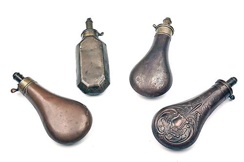 FOUR MID 19TH CENTURY POWDER-FLASKS, all bar one with small losses or repairs (4)