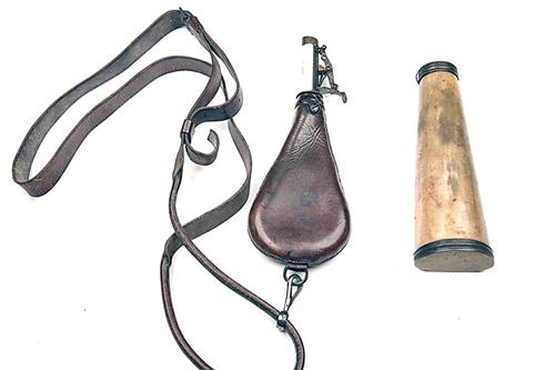 A LEATHER SHOT-FLASK COMPLETE WITH ORIGINAL LANYARD AND A HORN POWDER-FLASK, the first circa 1860, the second earlier but missing nozzle