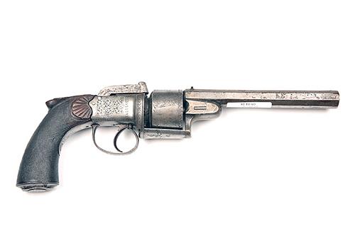 A 40-BORE PERCUSSION TRANSITIONAL REVOLVER, UNSIGNED, no visible serial number, circa 1845, with sighted 6 1/4in. octagonal barrel, scroll engraved London proved six-shot cylinder, scroll engraved boxlock action with offset bar-hammer, chequered walnut semi saw-handled walnut butt and guarded trigger, action at fault