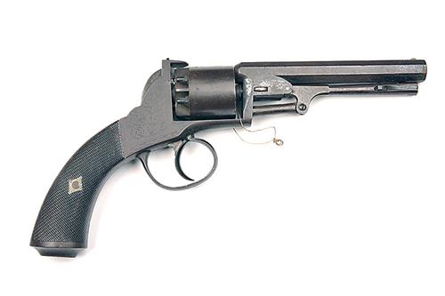 AN 80-BORE PERCUSSION REVOLVER SIGNED 'WM. JONES, MAKER', MODEL 'WEBLEY-BENTLEY TYPE', no visible serial number, circa 1848, with signed 5in. barrel also marked 'J. BOURNE', plain six-shot cylinder, articulated 'Colt' style rammer, engraved open frame and chequered walnut grips, traces of finish