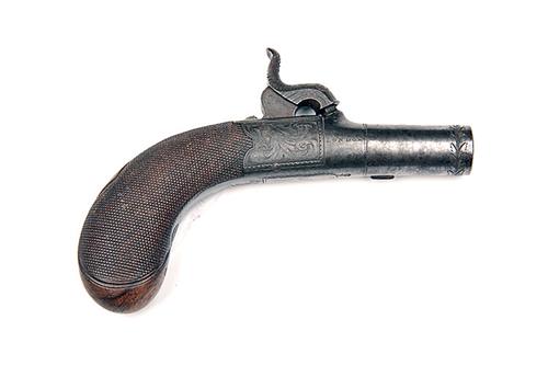 A 50-BORE PERCUSSION BOXLOCK POCKET-PISTOL SIGNED 'EGG & SONS, 1 PICCADILLY, LONDON', no visible serial number, circa1835, with turn-off 1 3/8in. round barrel , engraved band at muzzle, scroll engraved round iron body with central hammer and automatic trigger, bulbous chequered walnut butt and traces of finish